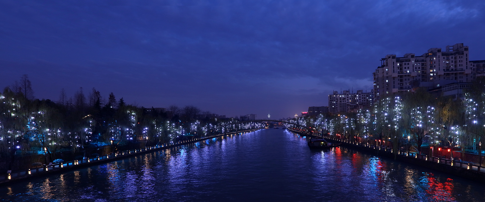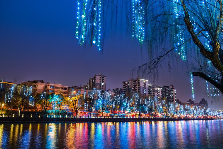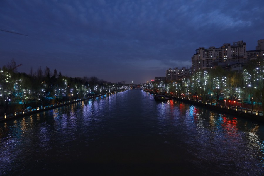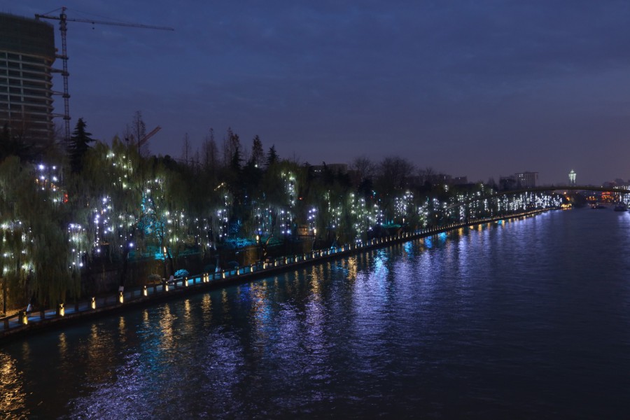 十里銀湖墅,透著螢火蟲般的點點星光,如夢如幻。兩岸柳樹上,采用仿真柳葉造型安裝的勇電LED點光源,猶如一顆顆亮晶晶的“小流星”。遠看兩岸宛若星瀑,近看宛若人在河邊走,光蘊葉中亮,使運河成為一條雅俗共賞的夜游路線。