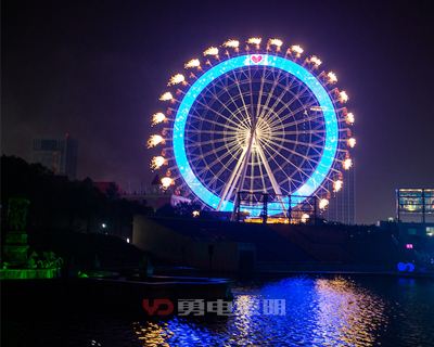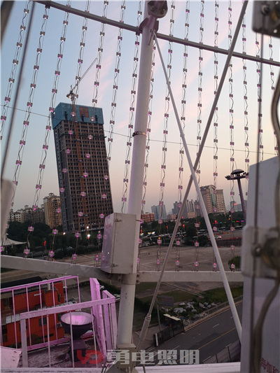 長(zhǎng)沙世界之窗摩天輪的環(huán)形LED顯示屏,采用了勇電半定制二次封裝Φ20點(diǎn)光源燈串,燈串沿著環(huán)