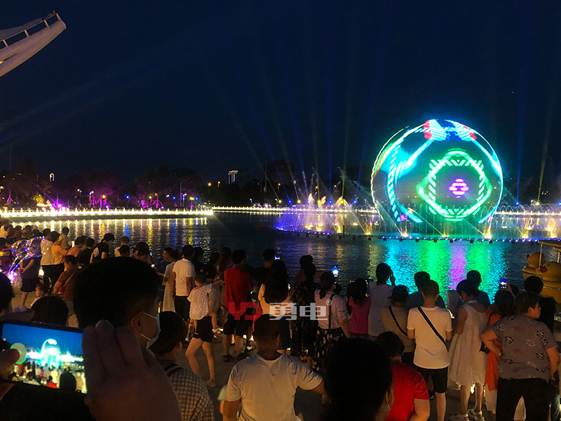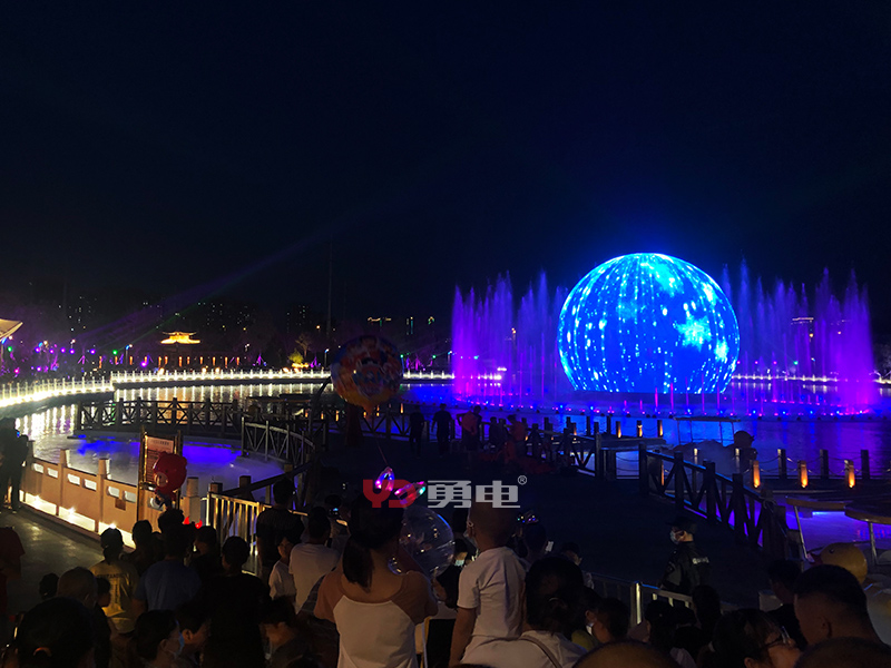 該燈光雕塑球體顯示屏采用勇電二次封裝Φ30LED點光源制作,配合噴泉表演燈光秀,色彩明麗,美輪美奐,同時也可用來播放宣傳視頻,與電腦實時聯(lián)機,將人文藝術(shù)與科技完美結(jié)合,打造了一場如夢似幻的光影盛宴。