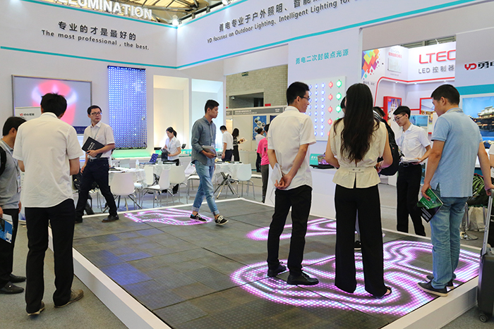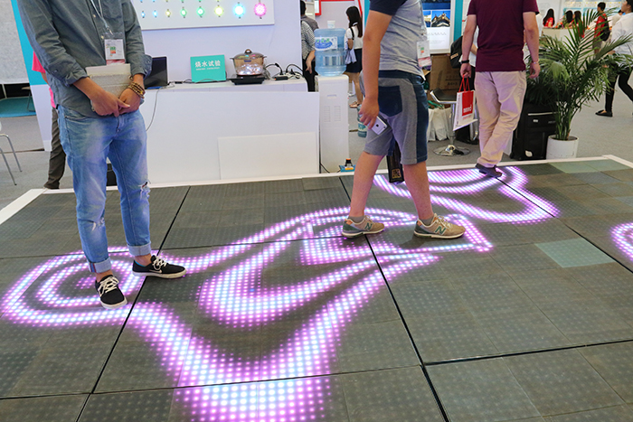 勇電照明展廳內(nèi),一塊大型的LED地磚顯示屏成為本屆展會上的焦點之一。該顯示屏采用勇電體感互動控制系統(tǒng),可以實現(xiàn)人體與燈光的互動,并可實現(xiàn)多人互動。當(dāng)人們站在地磚屏上,腳下屏幕上的動畫效果會隨著雙腳移動,智能化互動體驗吸引著來往的參展客戶駐足停留,并紛紛給予由衷的贊嘆。