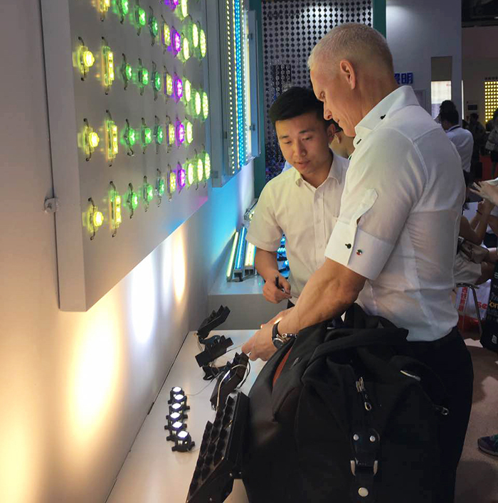 展會現(xiàn)場,除了常規(guī)的點光源、線條燈、洗墻燈外,參展觀眾對此次展出的新產(chǎn)品——勇電大功率燈具表現(xiàn)出了濃厚的興趣,紛紛駐足咨詢、交談。勇電IP68大功率系列燈具可任意組裝成不同形狀,實現(xiàn)了大功率LED燈具的小型化,可應(yīng)用于不同的場合和領(lǐng)域。